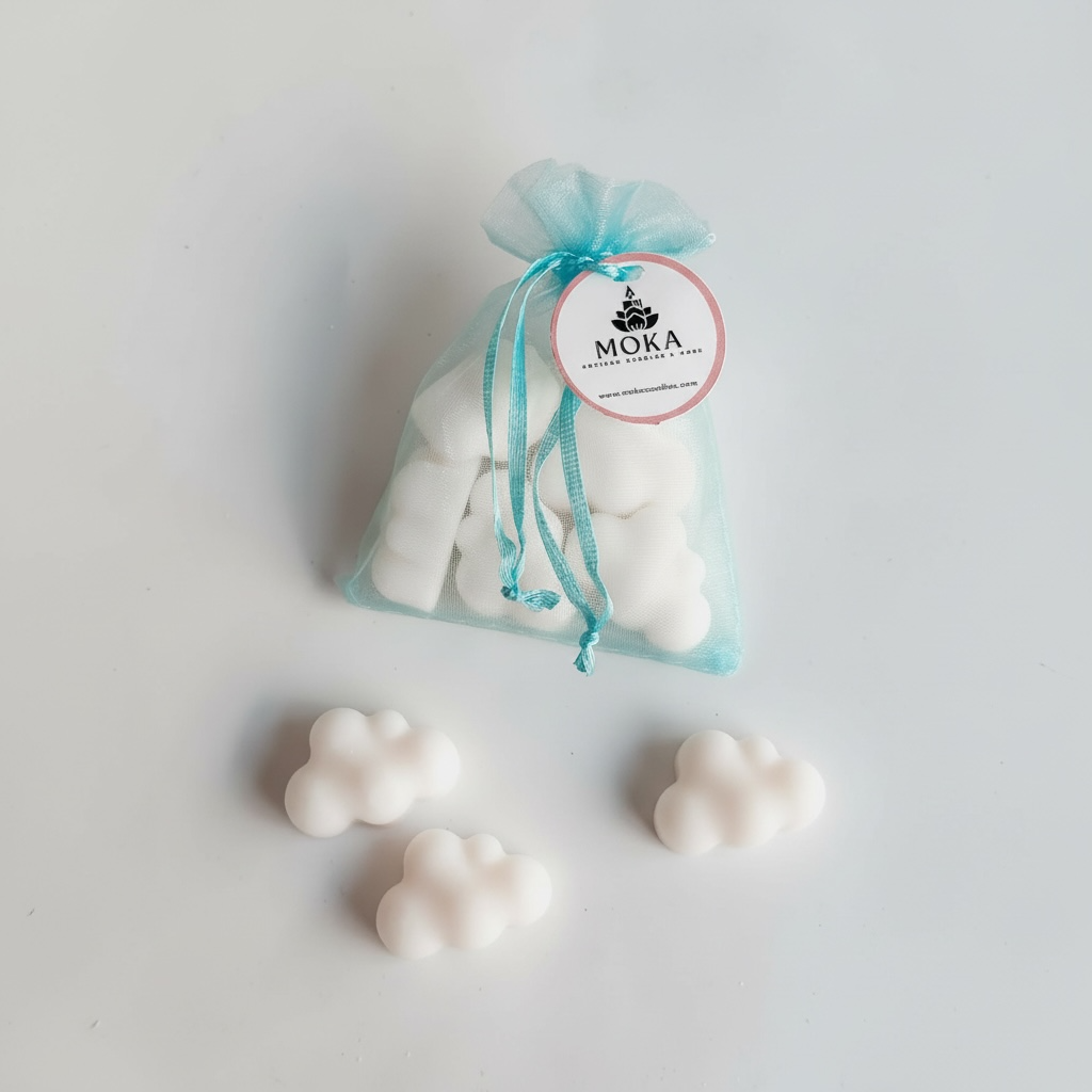 Κάθε πουγκάκι περιέχει 6 χειροποίητα συννεφάκια από κερί, τα οποία: